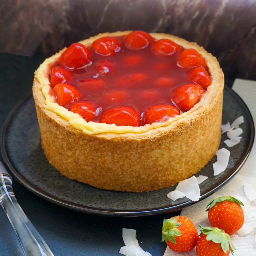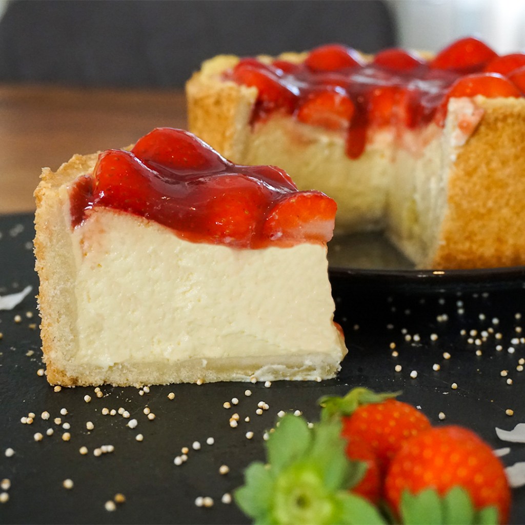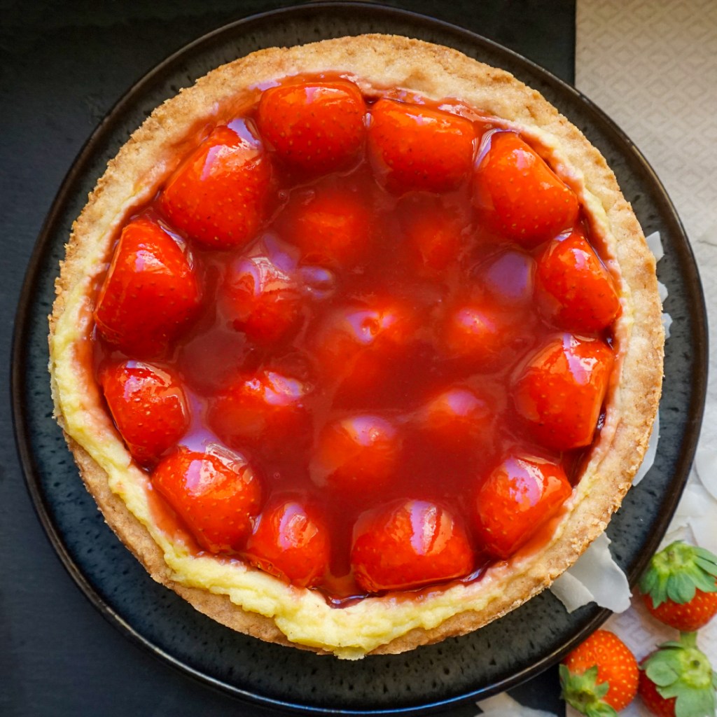 - Am nächsten Tag die Erdbeeren waschen und halbieren. In gewünschtem Muster auf dem Kuchen verteilen.