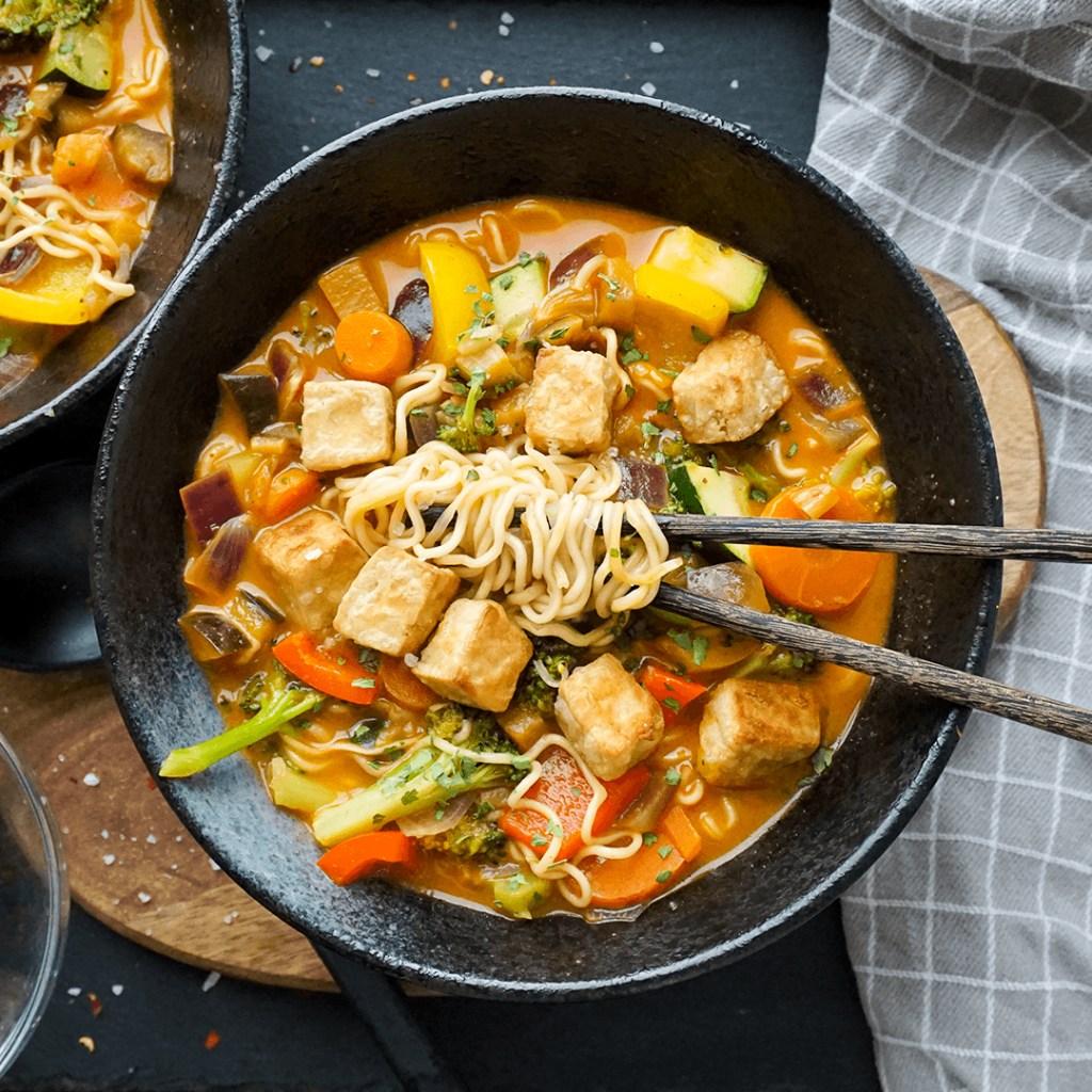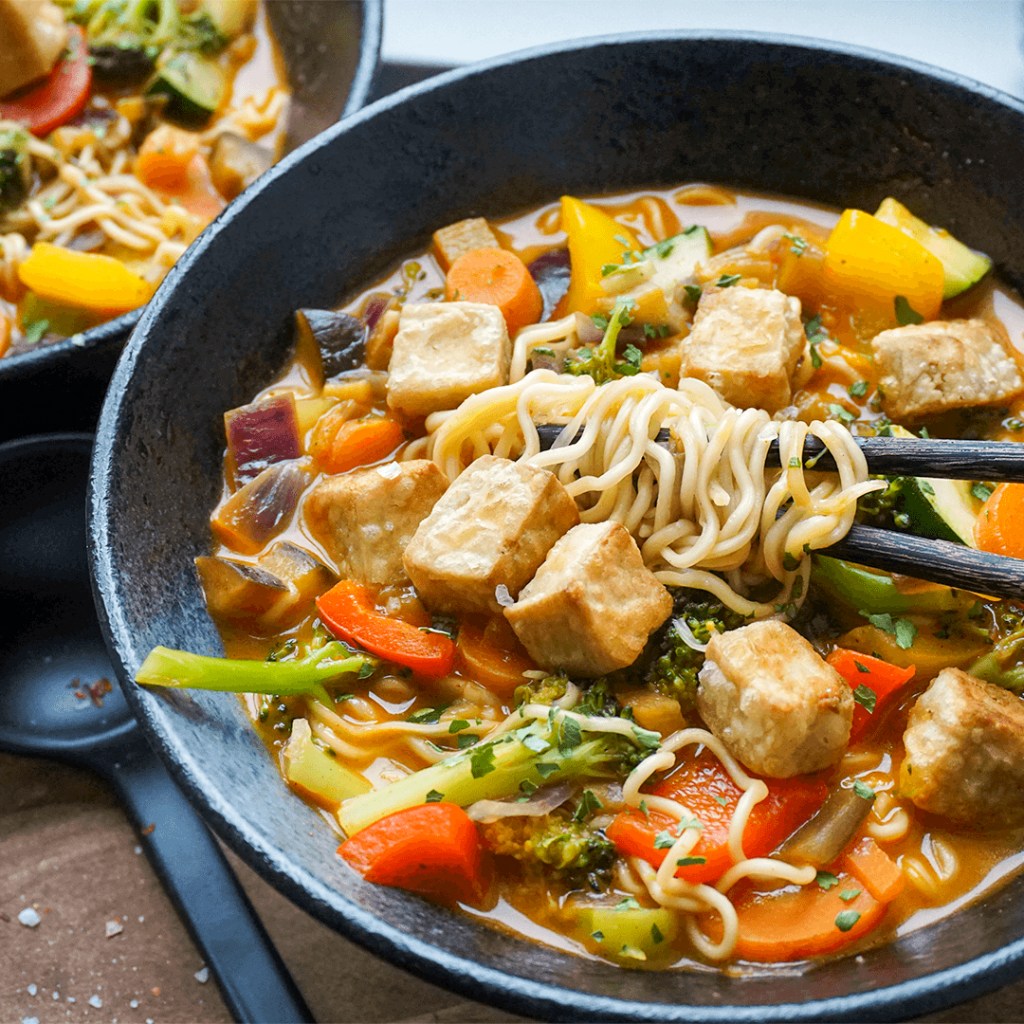 - Den knusprigen Tofu mit der Suppe servieren.