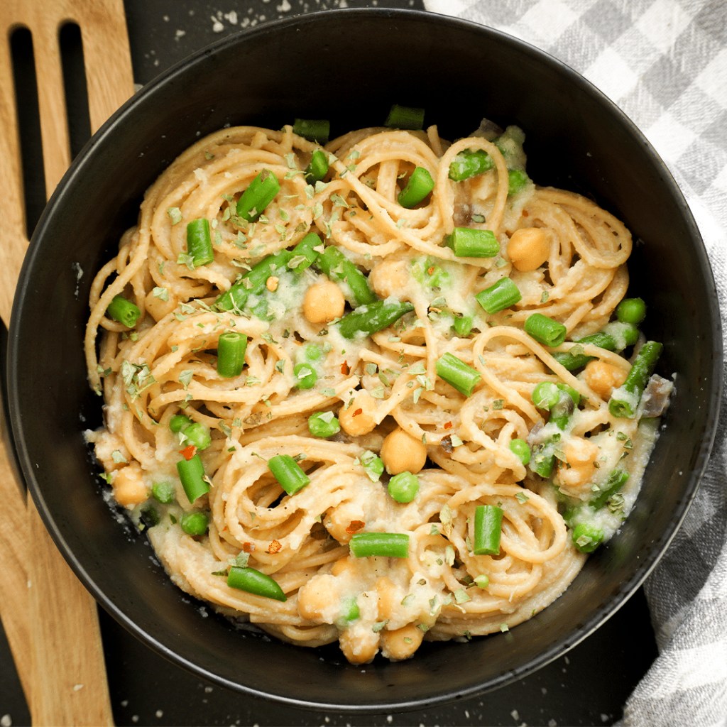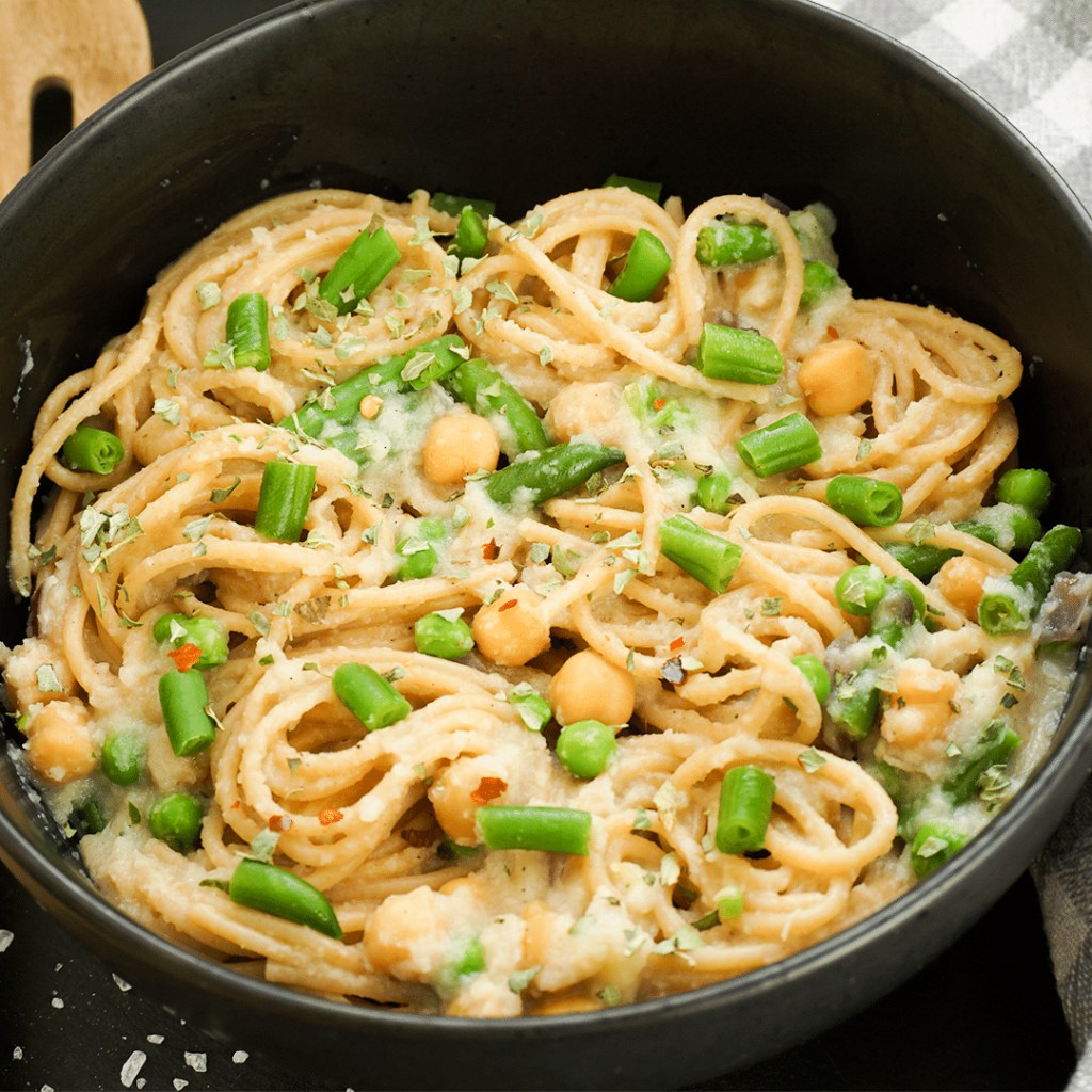 - In der “Zwiebel-Knoblauch-Pfanne” die Blumenkohlsauce, gekochten Spaghetti und Erbsen, Fisolen, sowie abgesiebten Kichererbsen vermischen.