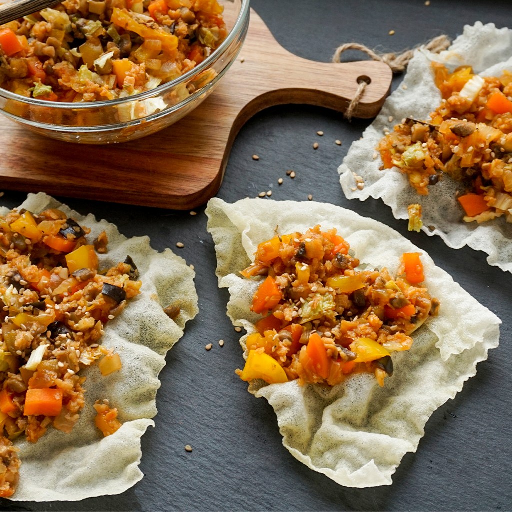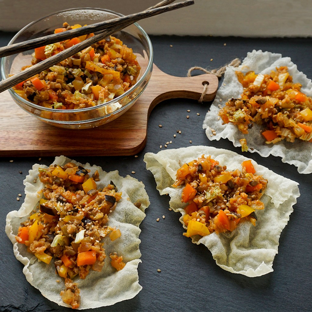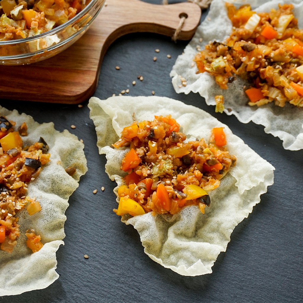 - Reispapier und Füllung servieren.