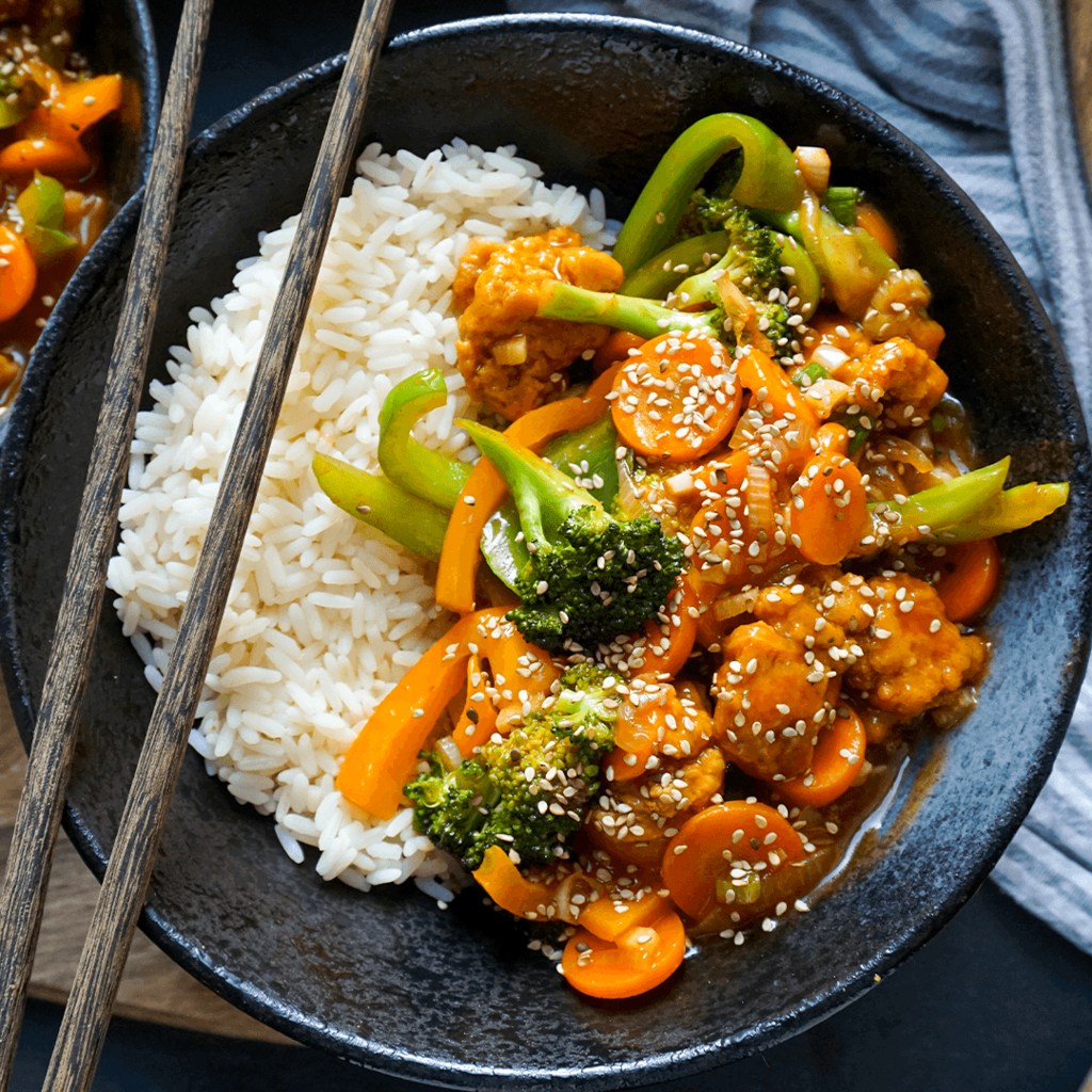 - Mit Reis und etwas Sesam anrichten.
