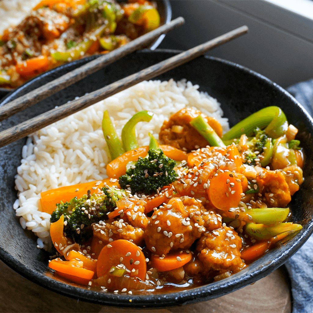 - Die Seitan Schnetzel scharf anbraten und gegen Ende untermischen.