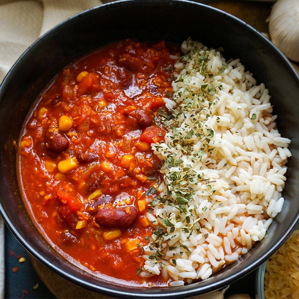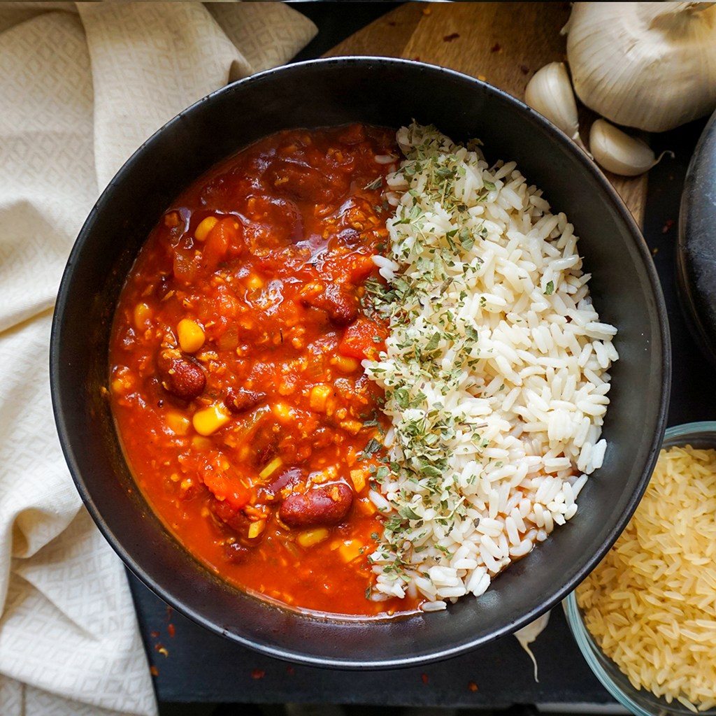 - Jetzt Tomaten gehackt, Tomaten passiert, Kidneybohnen, Mais und Gemüsebrühe mit in den Topf geben. Mit Salz und Pfeffer würzen und alles ca. 20-25 Minuten bei geringer Hitze köcheln lassen.