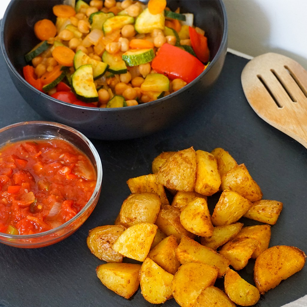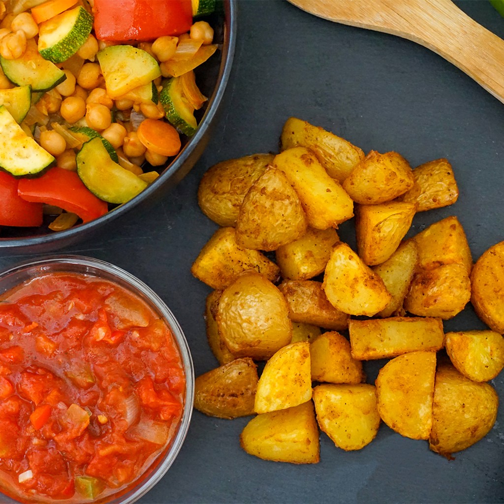- Die Kartoffeln auf einem Backblech verteilen und für 25-30 Minuten im Ofen backen.