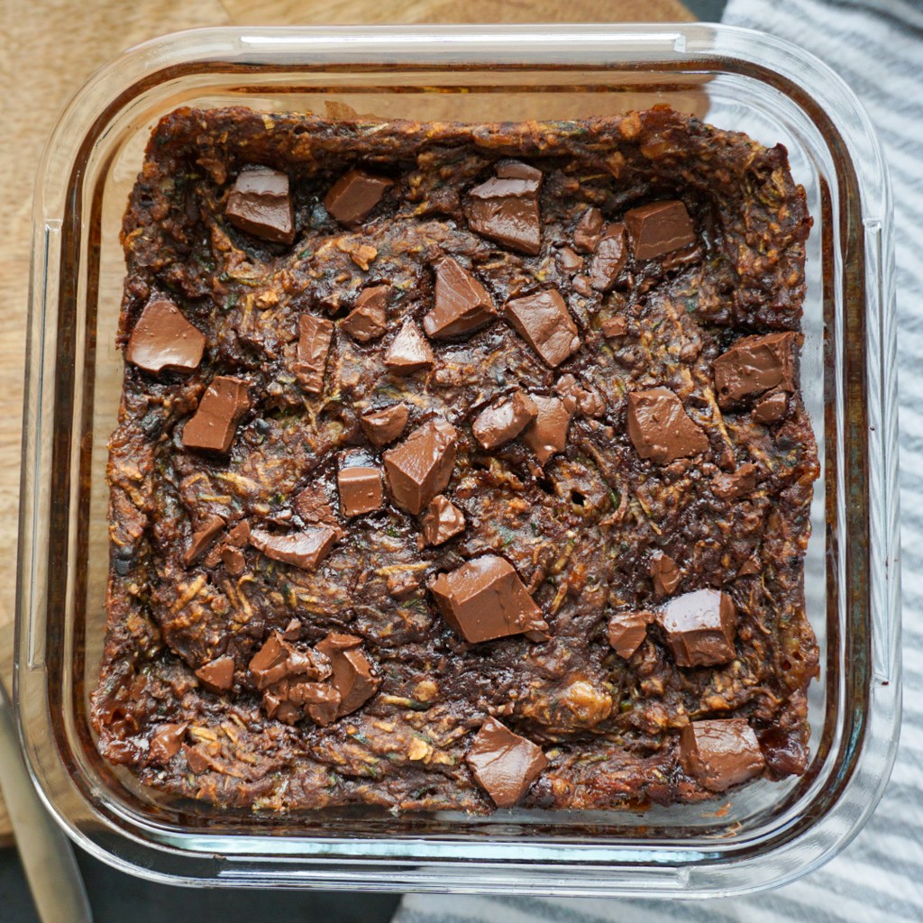- Den Teig in eine kleine ofenfeste Form geben. Die Schokolade zerhacken und darüber streuen.