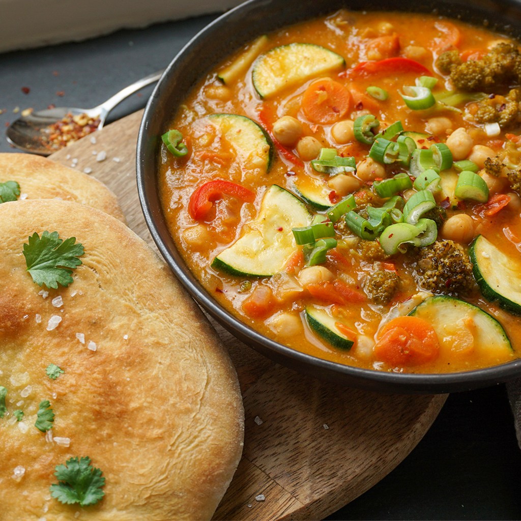 - Wenn die Tomaten weich sind, mit Gemüsebrühe ablöschen. Frühlingszwiebel, Paprika, Karotte, Brokkoli hinzugeben und ca. 20 Minuten kochen.