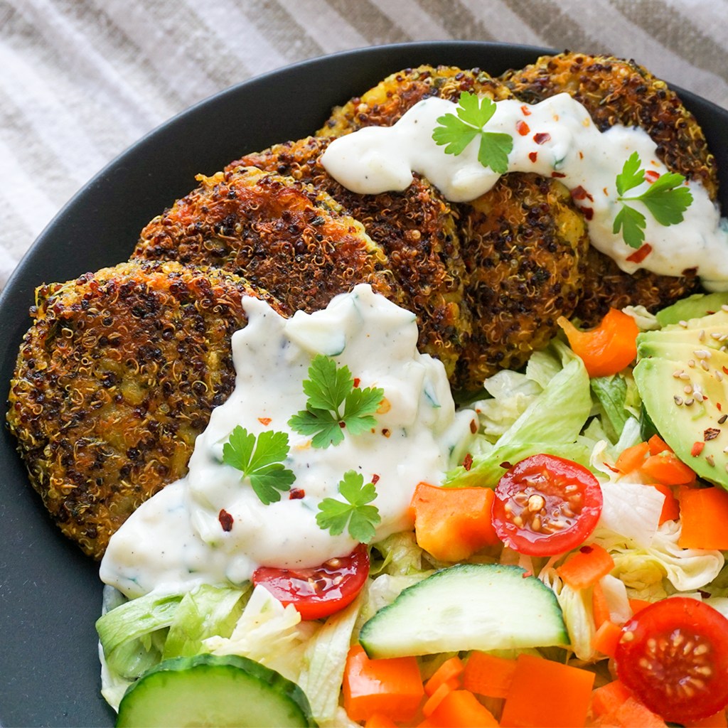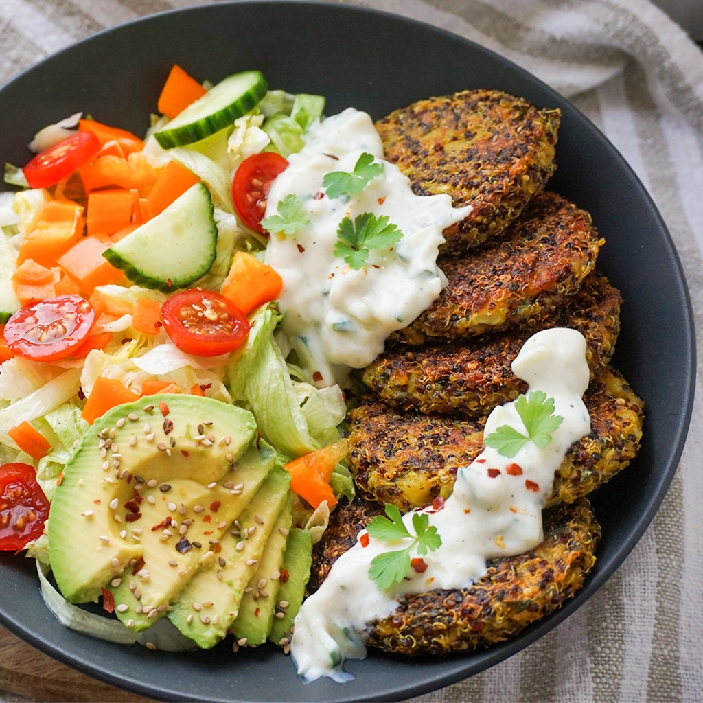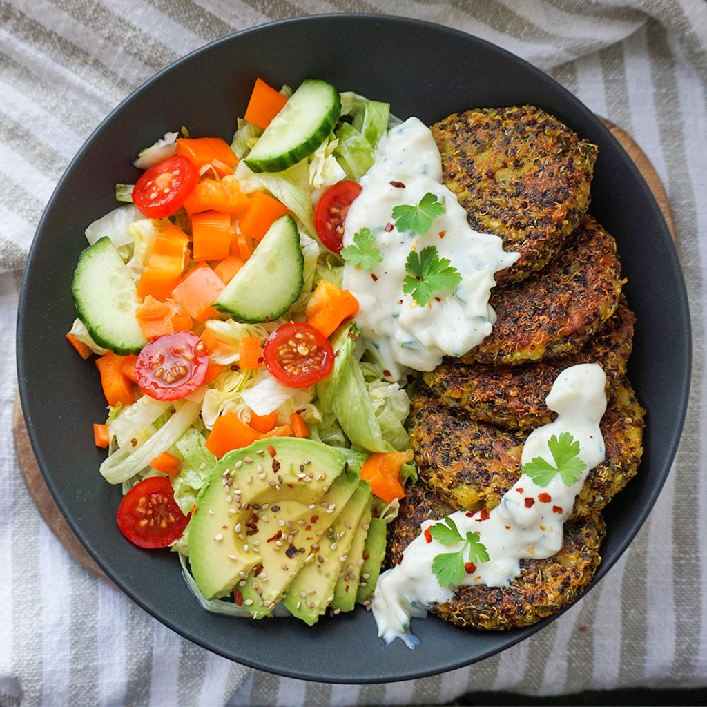 - Die Masse zu 12 Bratlingen formen. Öl in einer gut beschichteten Pfanne erhitzen und die Bratlinge auf beiden Seiten, bei mittlerer bis hoher Hitze, ca. 7 Minuten goldbraun braten.