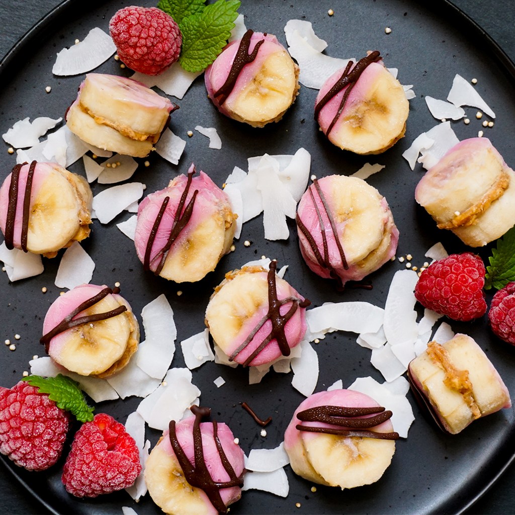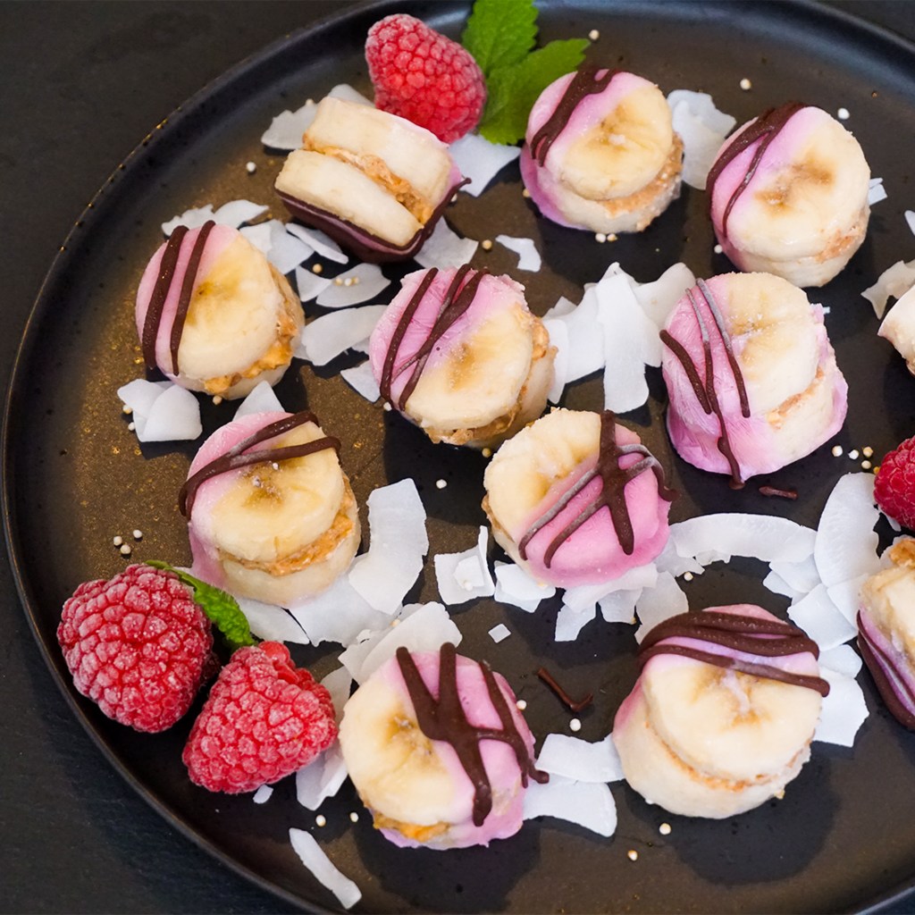 ein paar Stunden einfrieren. - Anschließend die Bananenstücke mit der