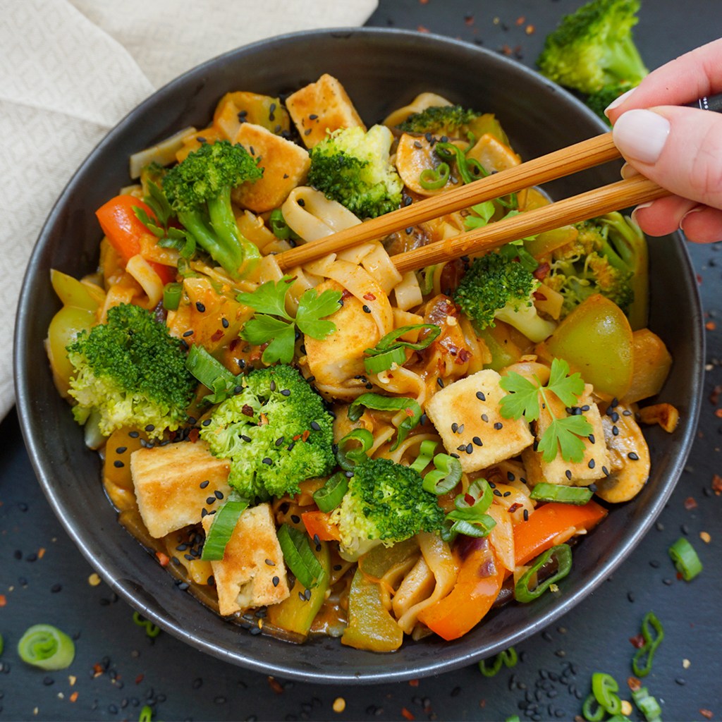 - Das gesamt Gemüse klein schneiden. Mit 1 EL Öl zuerst Zwiebel und Knoblauch ein paar Minuten braten. Danach Brokkoli, Champignons und Paprika ebenfalls einige Minuten anbraten. Nun die Curry Paste, Kokosmilch, Gemüsebrühe, Soja Sauce und Sriracha einrühren und mit Salz, Paprika Pulver und Chili abschmecken. Zum Schluss die Nudeln hinzugeben.
