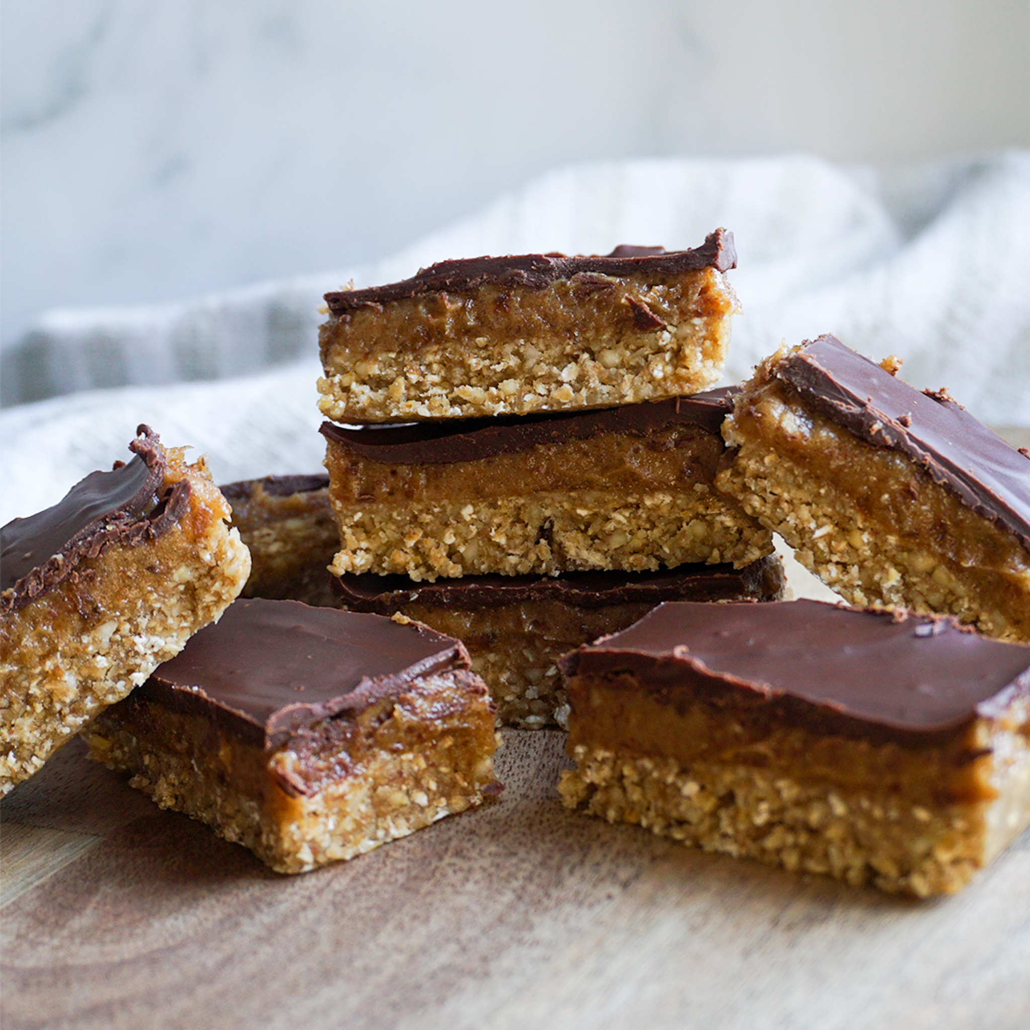 - Die Schokolade in der Mikrowelle oder im Wasserbad schmelzen und über die Dattelmasse geben; glatt streichen.