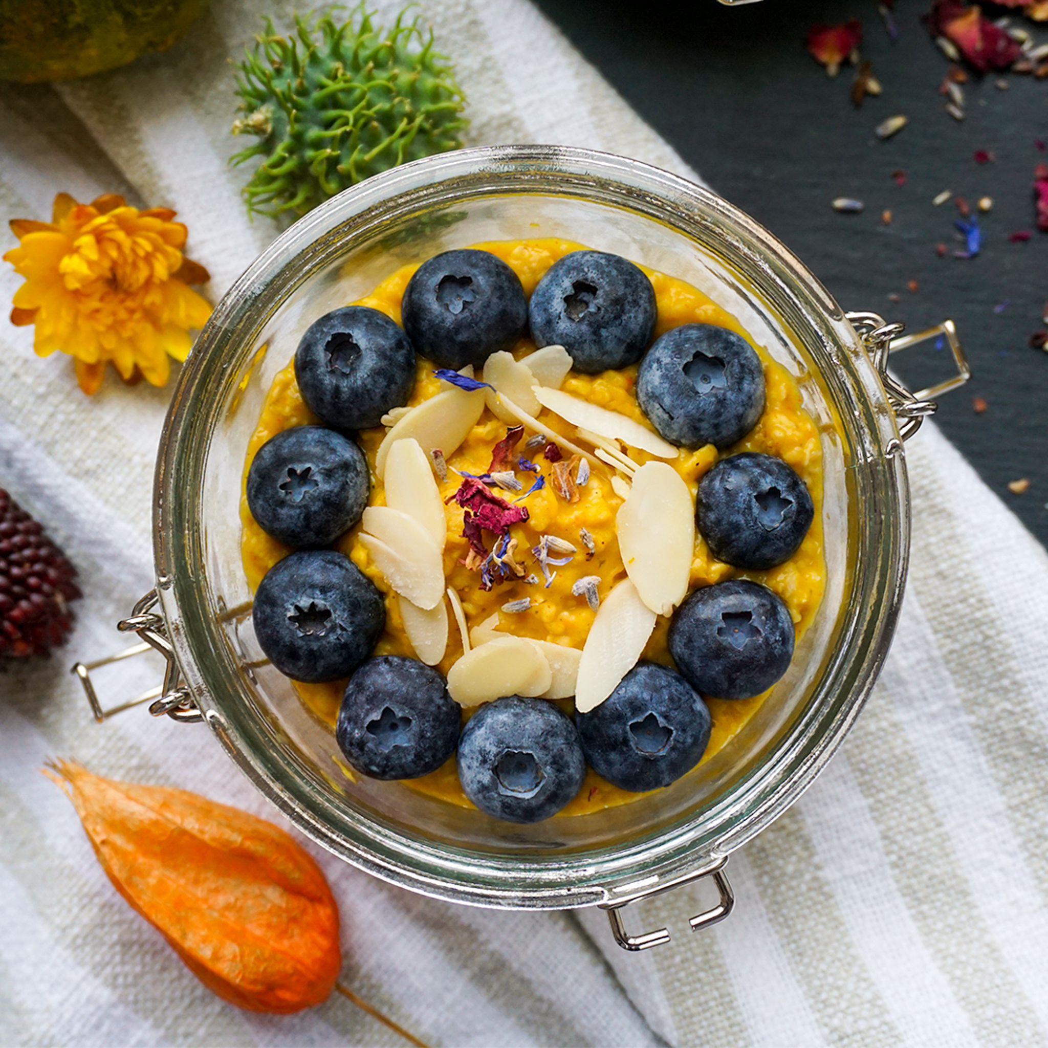 - Haferflocken, Haferdrink, Wasser, Kürbis-Püree,