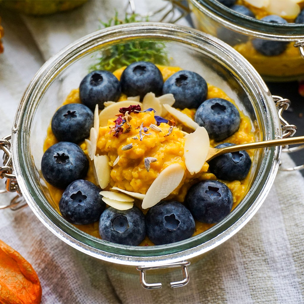 Pumpkin-Spice-Gewürz und Agavendicksaft in einem Topf aufkochen. Danach von der Platte nehmen und kurz ziehen lassen. - Mit Blaubeeren und Mandelblätter servieren.