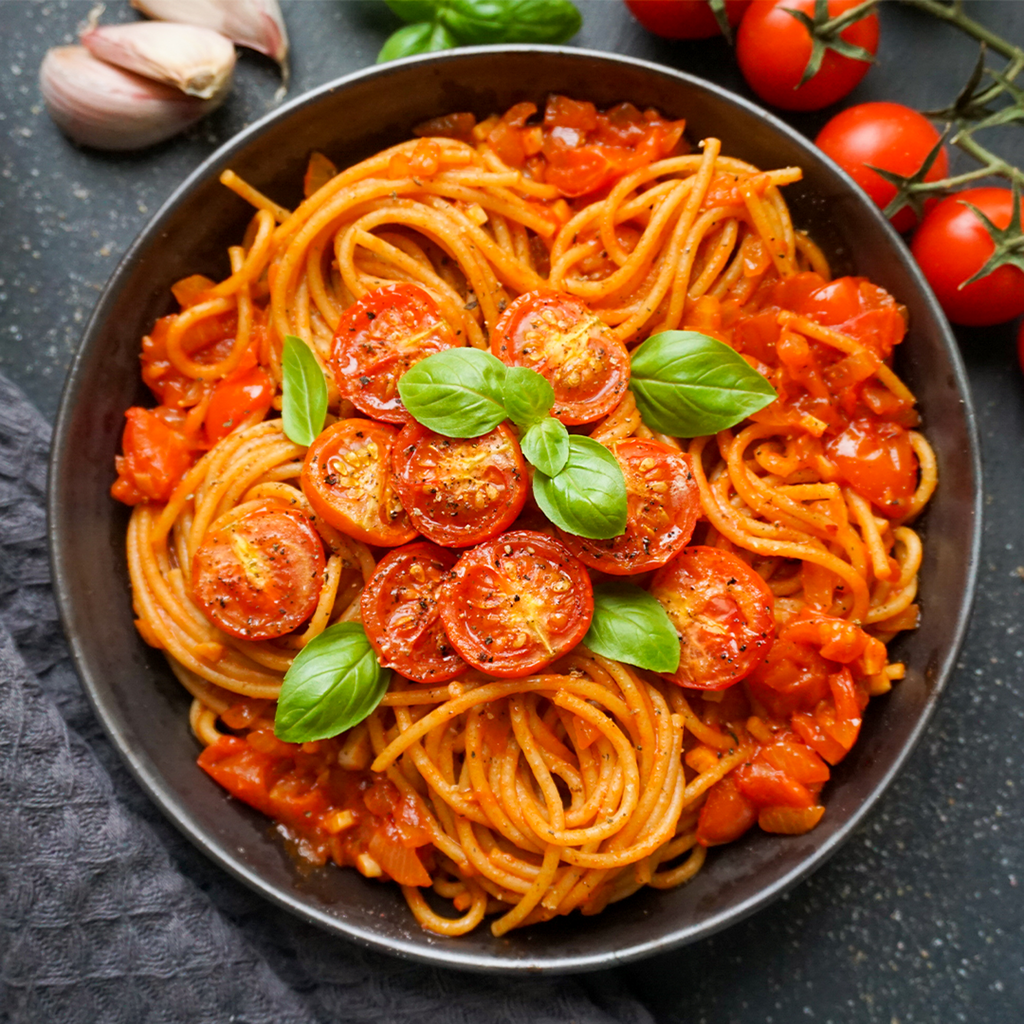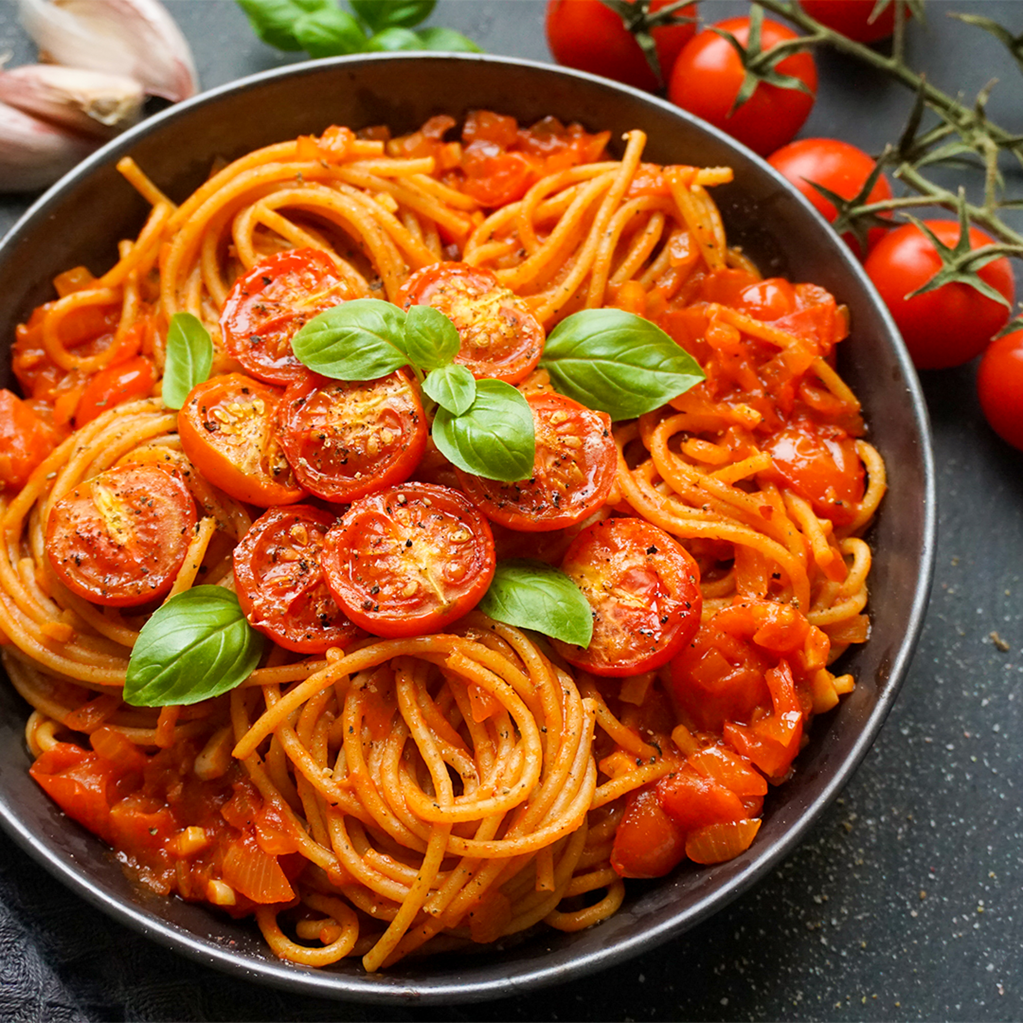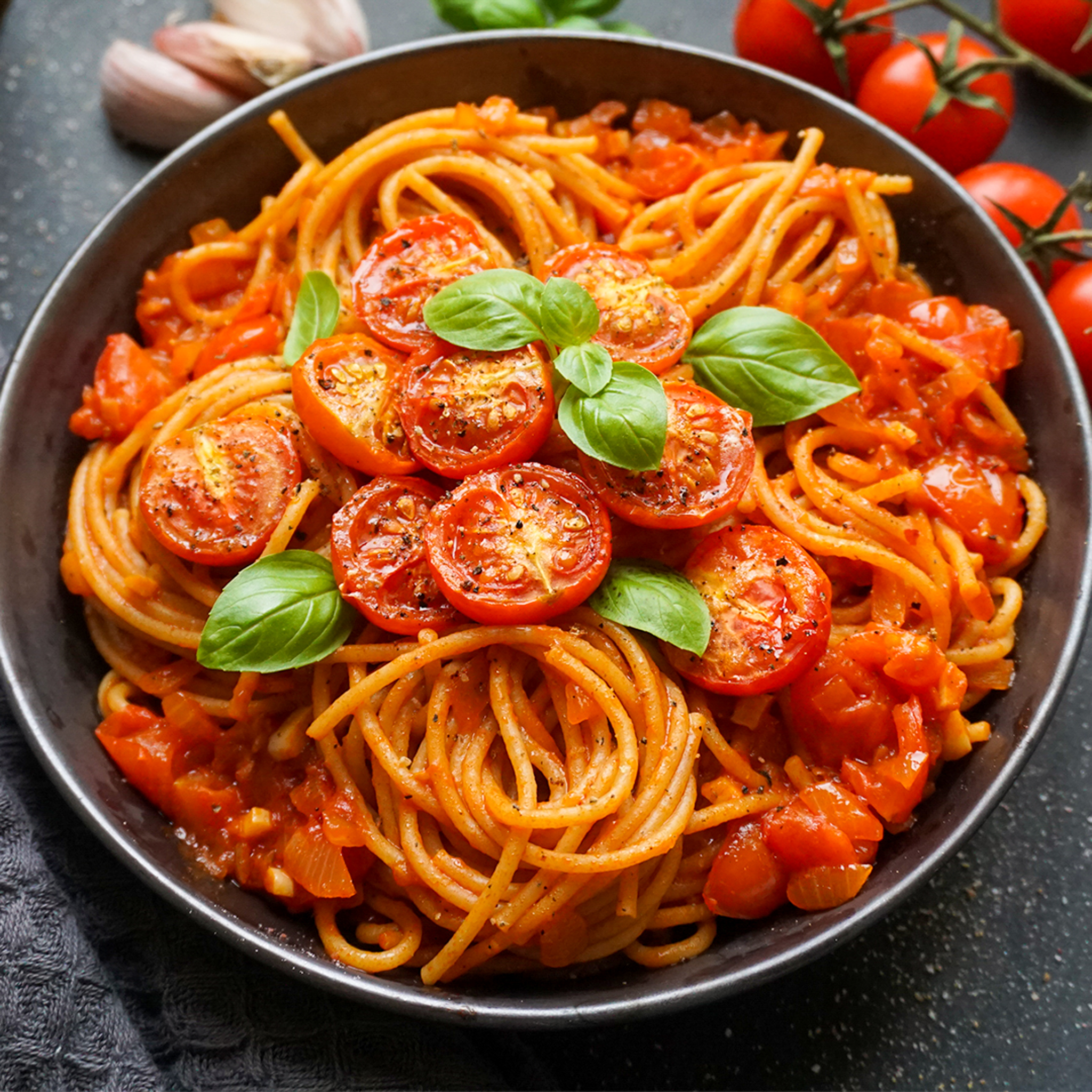 - Zum Schluss die Spaghetti in die Sauce geben und mit den gerösteten Tomaten und Pfeffer servieren.