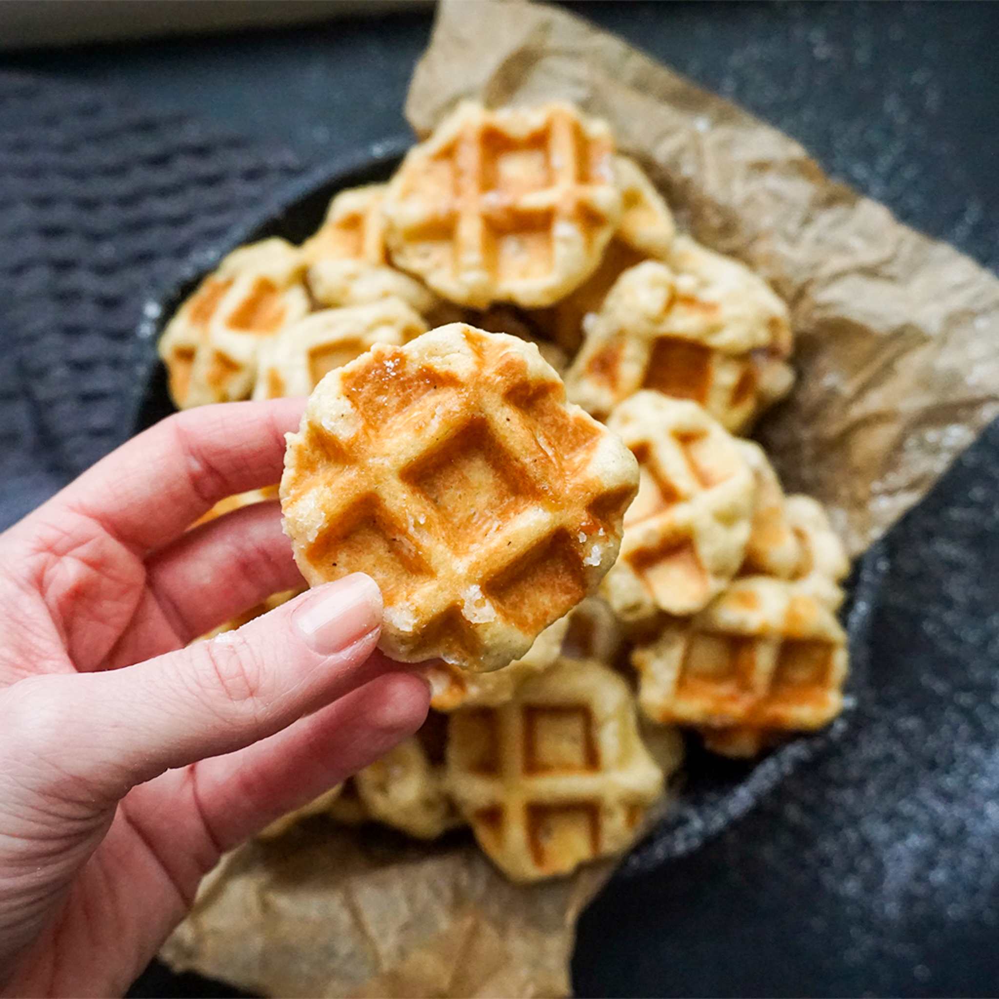 - Ein gut beschichtetes Waffeleisen erwärmen und bei mittlerer bis hoher Hitze die Waffeln backen. Dafür mit einem Teelöffel golfballgroße Bälle formen. Am besten immer 4 Stück gleichzeitig im Waffeleisen backen.