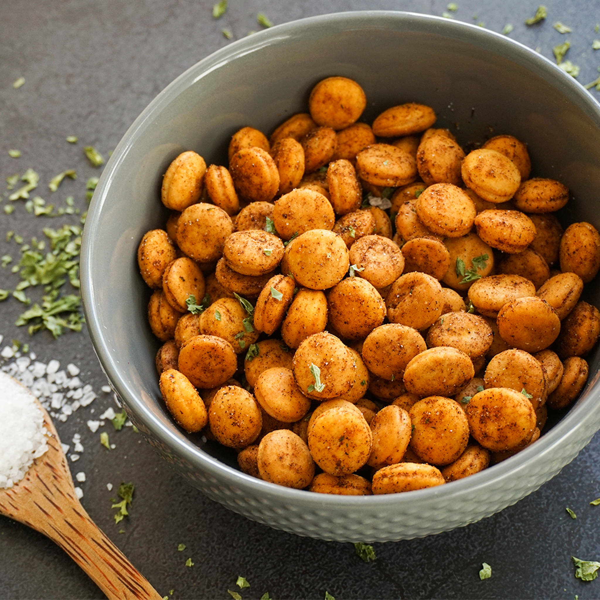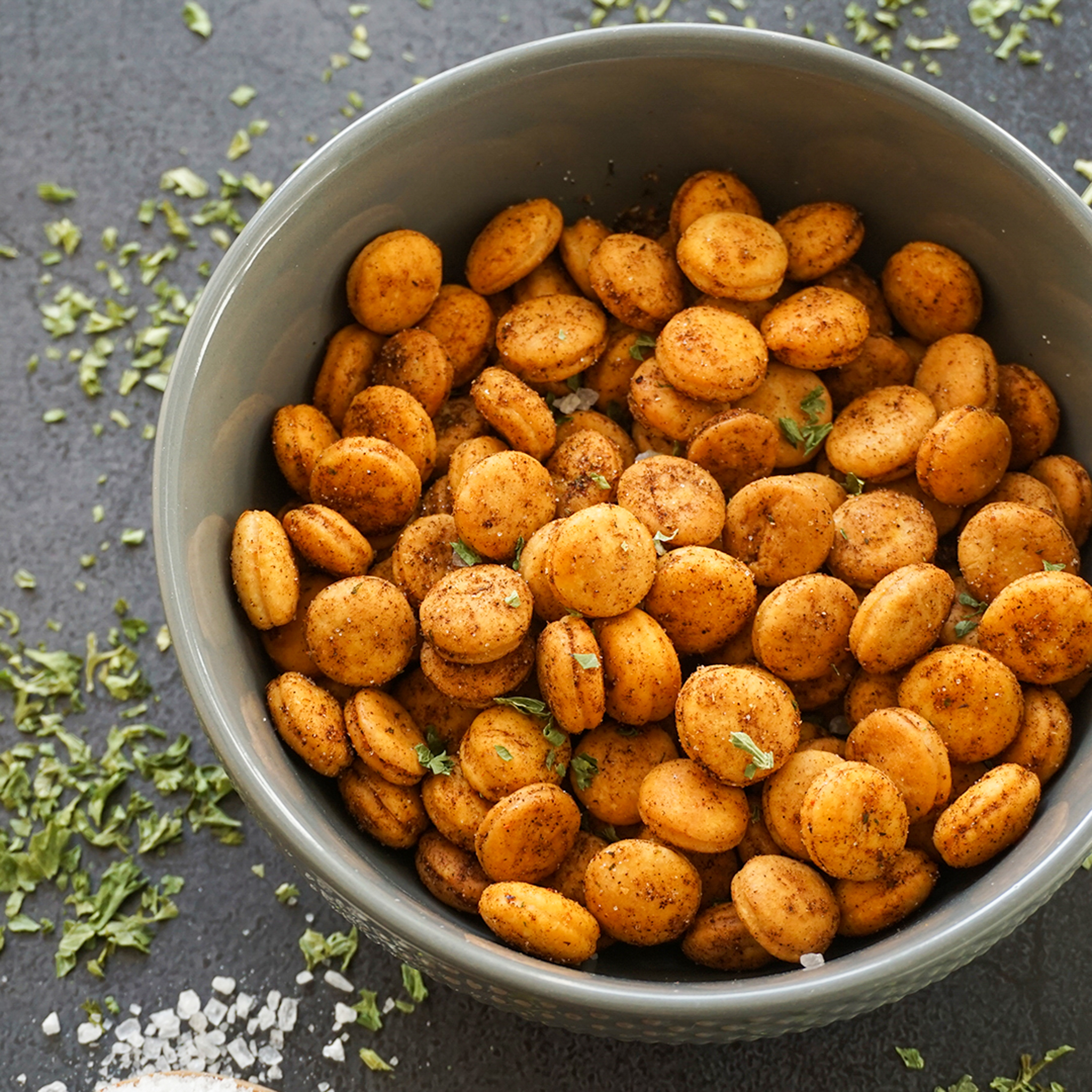 - Die gebackenen Cracker, Öl und die Gewürze vermischen und erneut auf einem Backblech verteilen.
