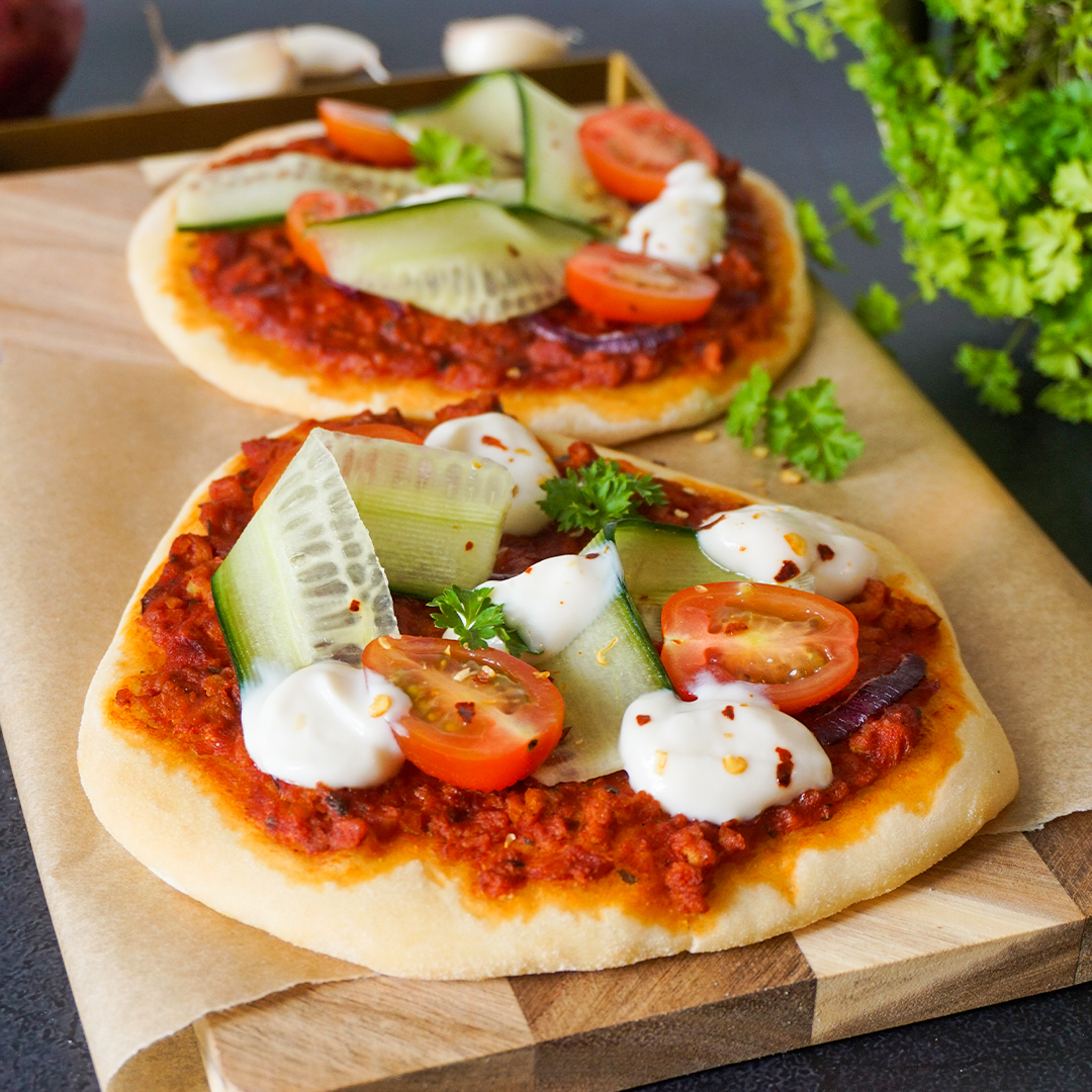 - In einer Pfanne Olivenöl erhitzen und Knoblauchzehen, Soja-Granula und Gewürze anbraten. Mit Tomaten passiert vermischen und abschmecken.