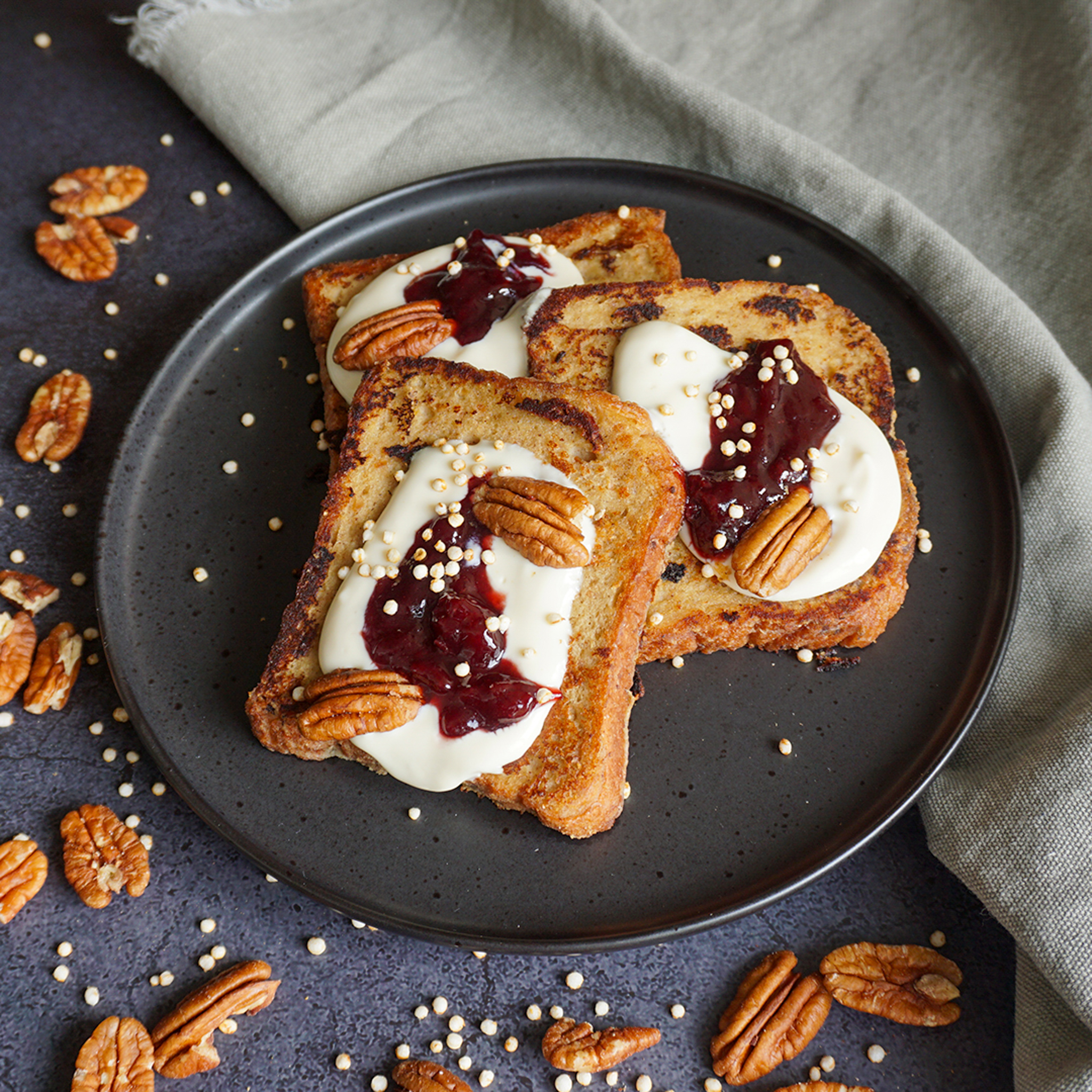 als Topping: Soja-Joghurt, Marmelade und Nüsse servieren.