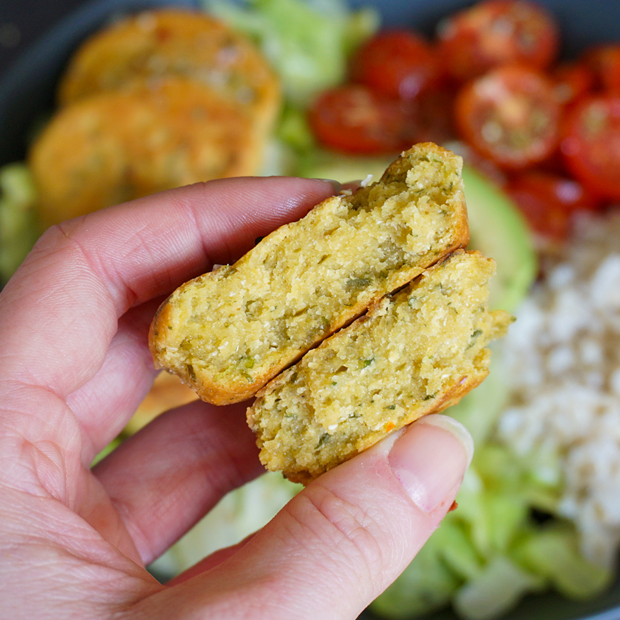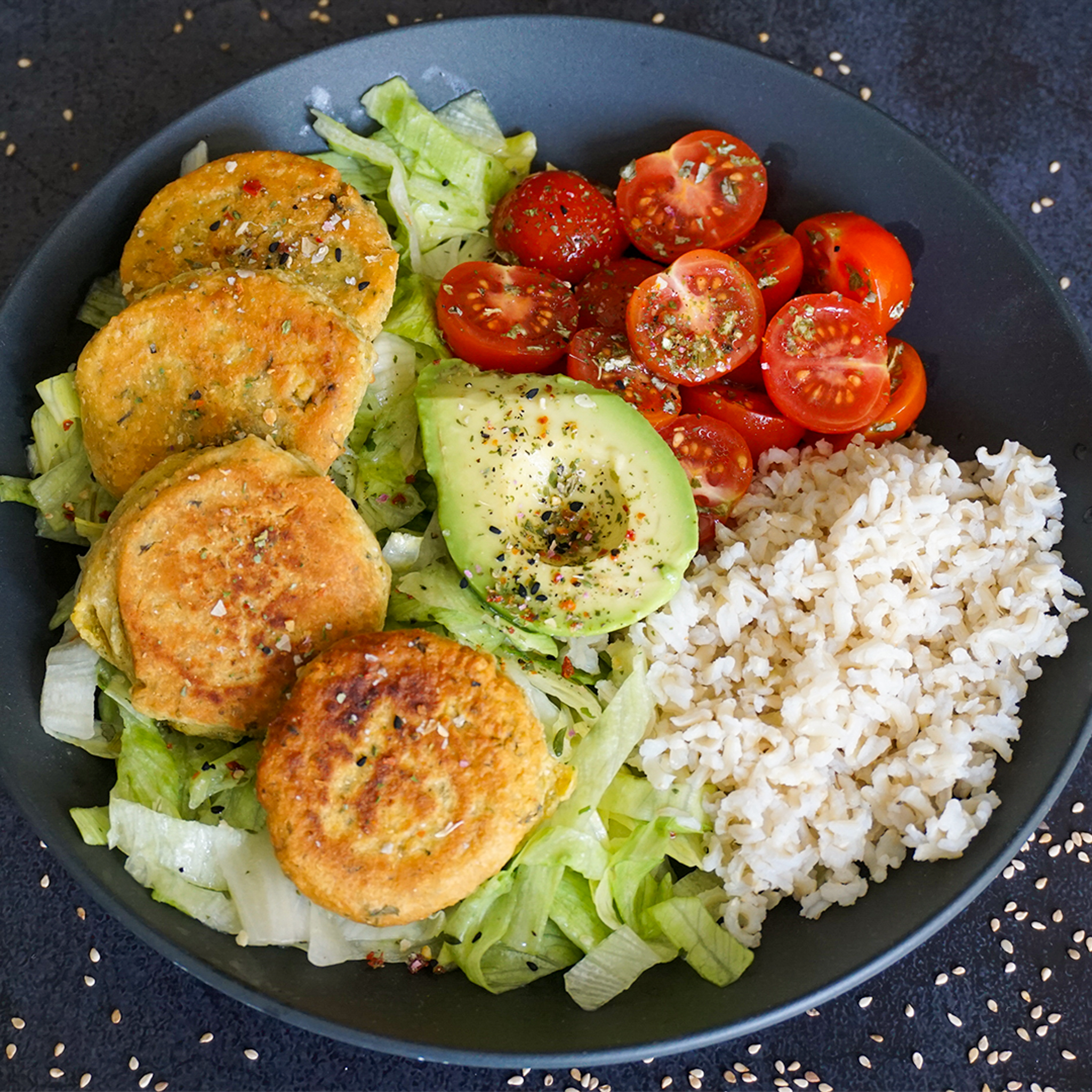 erhitzen und die Teiglinge auf allen Seiten goldgelb braten. - Hier: mit Salat, Tomaten, Avocado und Reis serviert.