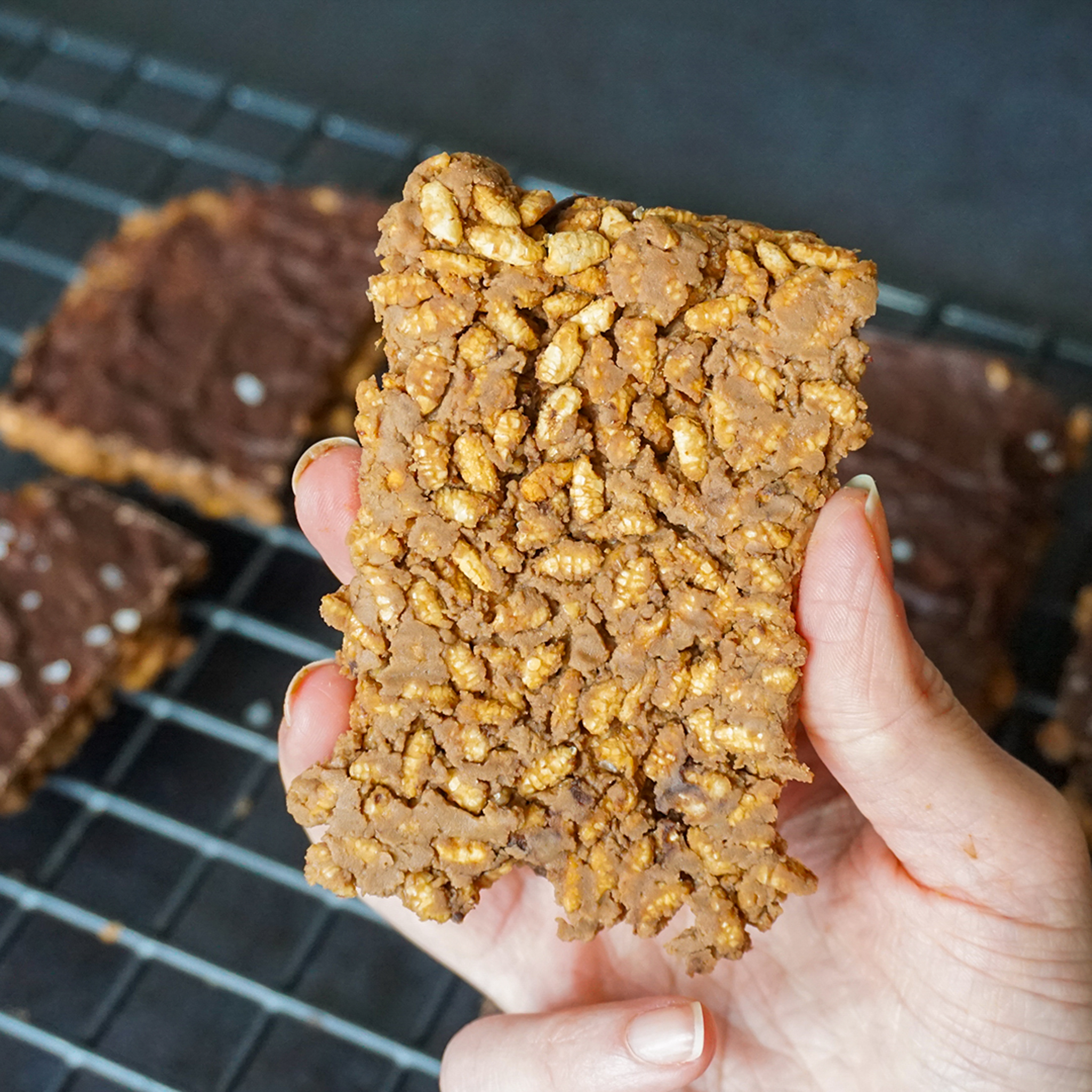 - Den gepuffter Reis unterrühren und die Masse in eine mit Backpapier ausgelegte Form (am Besten sowas wie eine kleine Auflaufform) drücken; glatt streichen und kühl stellen.