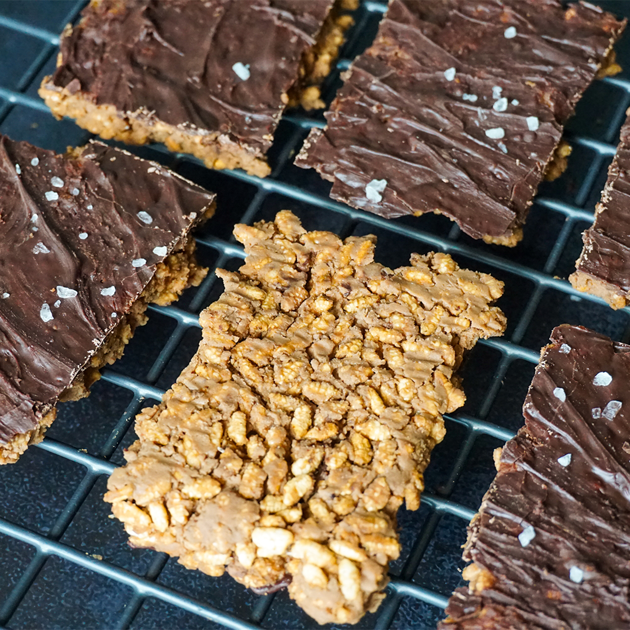 - Die Schokolade schmelzen und über die gekühlte Masse streichen. Etwas grobes Salz darüber verteilen.